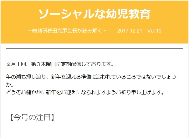 会員園ページにこのたび総幼研メルマガ登録フォームが設置されました。コチラから(パスワード要)ソーシャルな幼児教育〜総幼研秋田光彦会長が読み解く〜月1回、第3木曜日配信です。※現在、10回目の配信が終了いたしました。これからも、よろしくお願いい... -