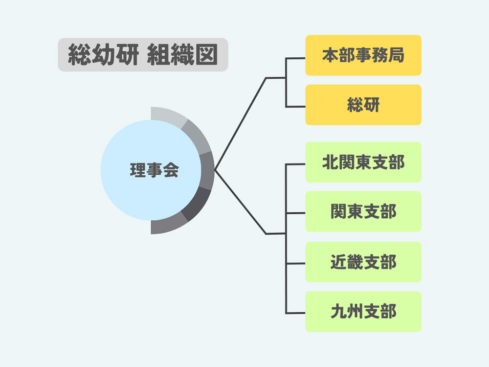 総幼研は、全国を4つの支部に分けて運営しています。支部は、所属園の先生方の互助的な運営で、支部主催の研修や園長会の開催などを通し、近隣園の連携・親睦・情報交換を図ります。
